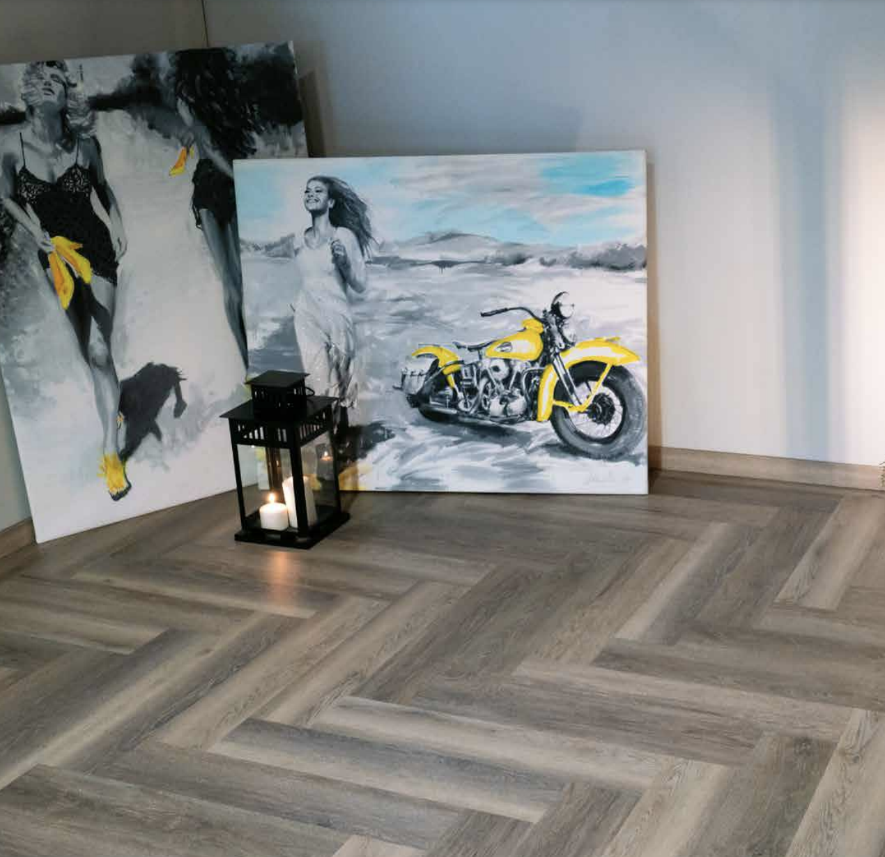 Pavimento superficie effetto legno con guaina integrata, taglio 90° per posa a spina di pesce.